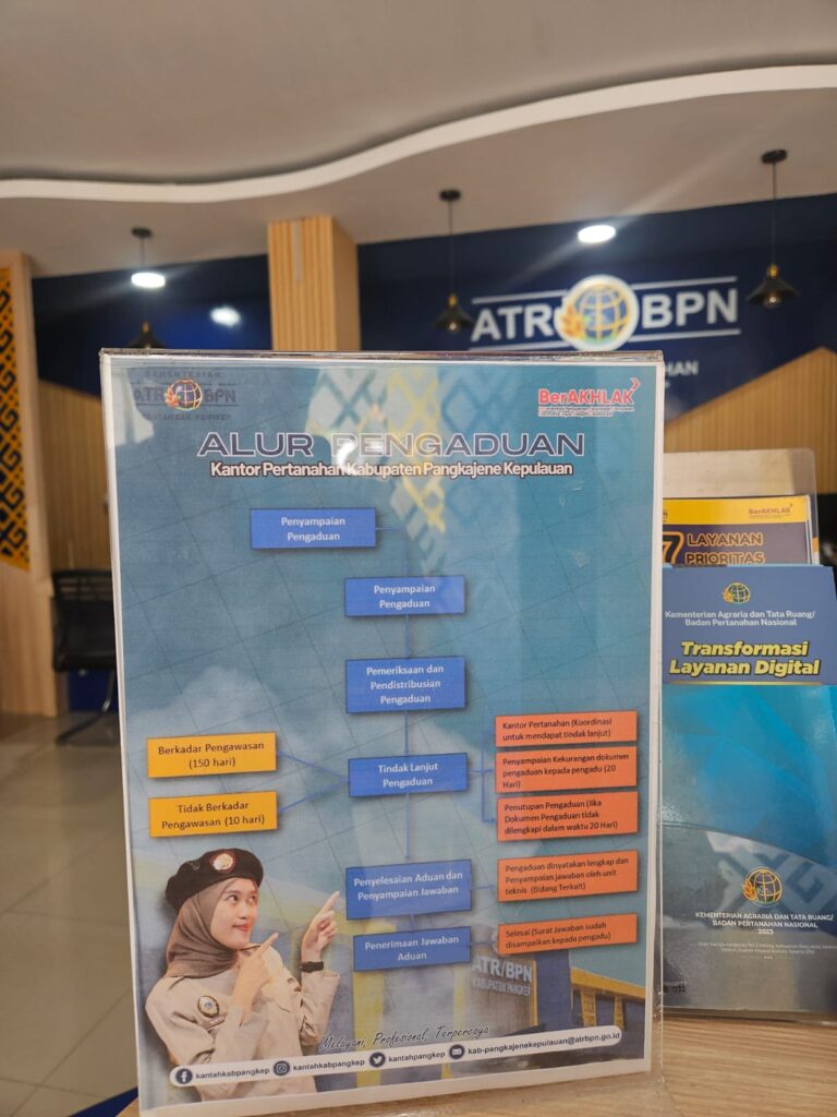 Pangkajene, Rabu (25/03/2026) — Dalam rangka meningkatkan transparansi dan kualitas pelayanan publik, Kantor Pertanahan Kabupaten Pangkajene Kepulauan menghadirkan alur pengaduan yang jelas dan terstruktur bagi masyarakat. Informasi ini disosialisasikan melalui banner resmi yang memuat tahapan penanganan pengaduan secara lengkap.